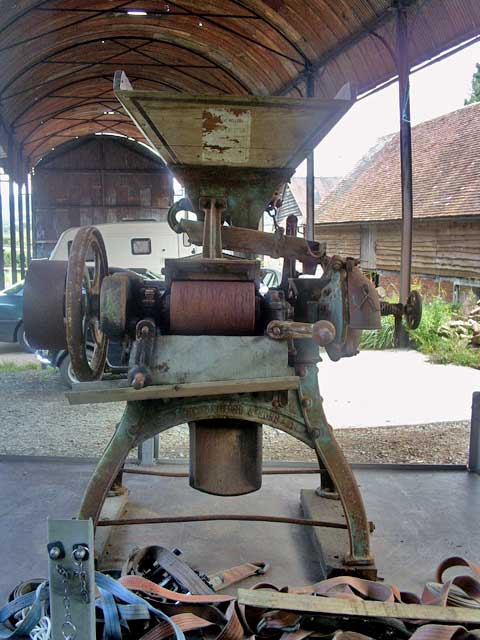 When restored this machine will be a useful addition to our collection of belt driven machinery as it has both rollers to crush grain and a plate mill, similar to our millstone pairs but made in cast iron, fitted on the end. The wooden hopper still has the painted sign writing on it and the printed instructions pasted to the outside. There is a fair amount of wear and tear evident but the machine is complete as far as we can tell and should be reasonably easy to bring back into working order.