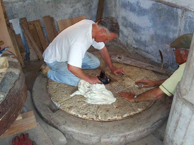 All it took was to lift the spindle that weighs over a hundredweight (50 kilos for our younger readers) into place, threading it through the stone nut on the way.
