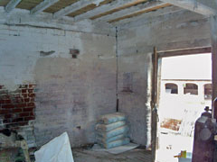 It then dries to a stark white, we hope! Some of the previous limewash can be seen at the top left of the picture, much whiter than the fresh coat.